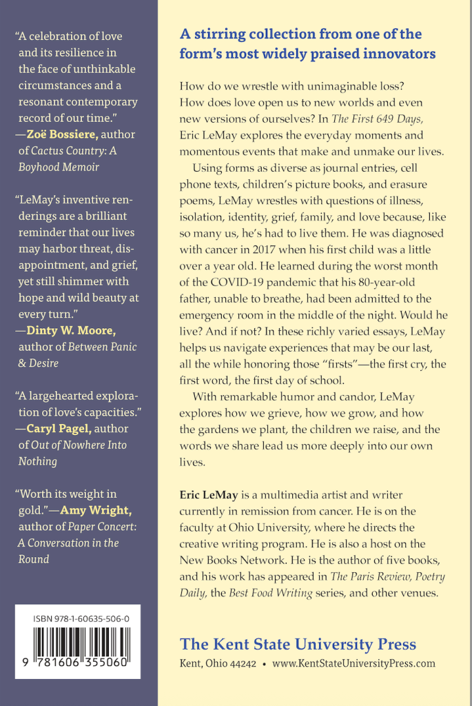 Eric LeMay’s The First 649 Days: Essays and Other Acts of Love has been called “a work of breathtaking honesty and heart,” “profoundly human,” and “a largehearted exploration of love’s capacities as well as an experiment in documenting the now via forms as various as a cancer diary, children’s book, birth story, field guide, afterworld address, medical erasures, first words journal, pandemic triptych, birdseed performance piece, and worry list, among others.”